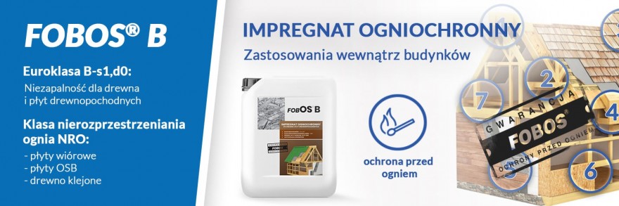Najlepszym wyborem jest tutaj impregnat FOBOS® M-4, który nie tyko pozwala skutecznie zabezpieczyć drewno przed ogniem, lecz również chroni przed rozwojem grzybów domowych, pleśniowych i owadów. Ten środek od lat znajduje zastosowanie przy impregnacji tarcicy przeznaczonej na więźbę dachową, czy przy zabezpieczaniu prefabrykowanych wiązarów. Środek ten nie powinien być stosowany w warunkach zewnętrznych, przy narażeniu na kontakt z opadami atmosferycznymi. Dopuszcza się jedynie tymczasowe zawilgocenie zaimpregnowanych elementów, przy zapewnieniu odpowiedniej wentylacji konstrukcji. Dokładne wentylowanie zaimpregnowanych konstrukcji jest dodatkowo bardzo istotne, ponieważ solne środki po zastosowaniu mogą przyczyniać się do okresowego wilgotnienia powierzchni, które w niekorzystnych warunkach mogłyby stworzyć warunki do rozwoju grzybów. Środek pozwala na zabezpieczenie drewna konstrukcyjnego do klasy „niezapalności” i „nierozprzestrzeniania ognia NRO” (zgodnie z PN-EN 13501-1+A1:2010).