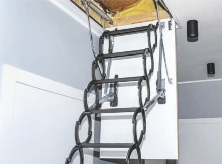 Schody nożycowe składają się w harmonijkę, a po rozłożeniu tworzą stateczną drabinę. Wykonane są ze stali. Najpopularniejsze są modele aluminiowe – solidne, odporne na korozję i bardzo lekkie. Schody nożycowe zajmują w stropie mniej miejsca niż segmentowe, ale pamiętajmy, że mały otwór utrudnia wniesienie na strych przedmiotów sporych rozmiarów. Natomiast bez problemu można je dopasować do wysokości pomieszczenia – wystarczy odkręcić lub przykręcić stopień. Można je montować w pomieszczeniach o wysokości do 330 cm, maksymalne obciążenie wynosi 200 kg.
