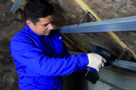 Odmierzamy odcinki wełny mineralnej Ekoroll lub Unifit lub Classic równe odległości pomiędzy krokwiami z 2 cm naddatkiem. Maty Unifit posiadają specjalne oznaczenie "---" co pozwala na łatwe odmierzenie i przycięcie odpowiednich odcinków izolacji. Ponieważ maty Knauf Insulation są skompresowane po rozpakowaniu rolki wełna ulega rozprężeniu do swojej deklarowanej grubość.