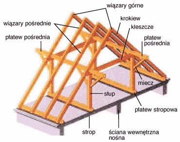 W domach jednorodzinnych i części wielorodzinnych, najbardziej popularnym typem konstrukcji dachu są konstrukcje drewniane. Konstrukcje dachów wykonuje się głównie z drewna sosnowego, ewentualnie świerkowego. Natomiast drobne elementy (wkładki, kołki, itp.), z drewna twardego: dębowego, akacjowego lub innego, o podobnych właściwościach. Drewno na elementy więźby dachowej, powinno być odpowiednio wysuszone (maksymalnie 20% wilgotności) oraz zabezpieczone przed działaniem czynników biologicznych oraz ognia.