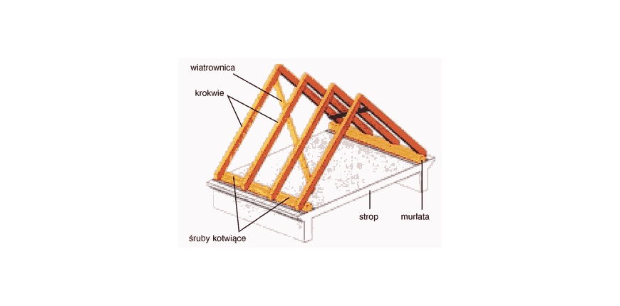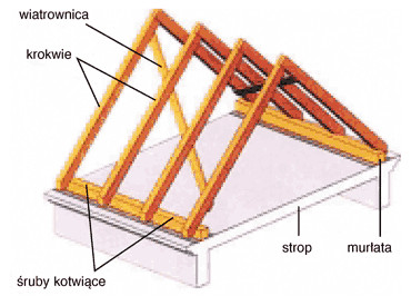 Więźba krokwiowa - jest to najprostsza konstrukcja dachowa, stosowana, gdy rozpiętość ścian zewnętrznych nie przekracza 6,0 m a nachylenie połaci dachowej 40-60°. Podstawowym elementem nośnym jest para krokwi, połączonych ze sobą w kalenicy, o długości max. 4,5 m, rozstawionych w odstępach 80-120 cm. Ich dolne końce mogą być mocowane do poziomej belki ściągowej, stanowiącej jednocześnie konstrukcję nośną stropu lub do murłat ułożonych na stropie lub na wierzchu ścian kolankowych. Przy tego typu konstrukcji dachowej, zarówno mocowanie krokwi do murłat, jak i murłat do konstrukcji budynku musi być bardzo solidnie wykonane, ponieważ od solidności tych połączeń zależy stabilność i bezpieczeństwo dachu.